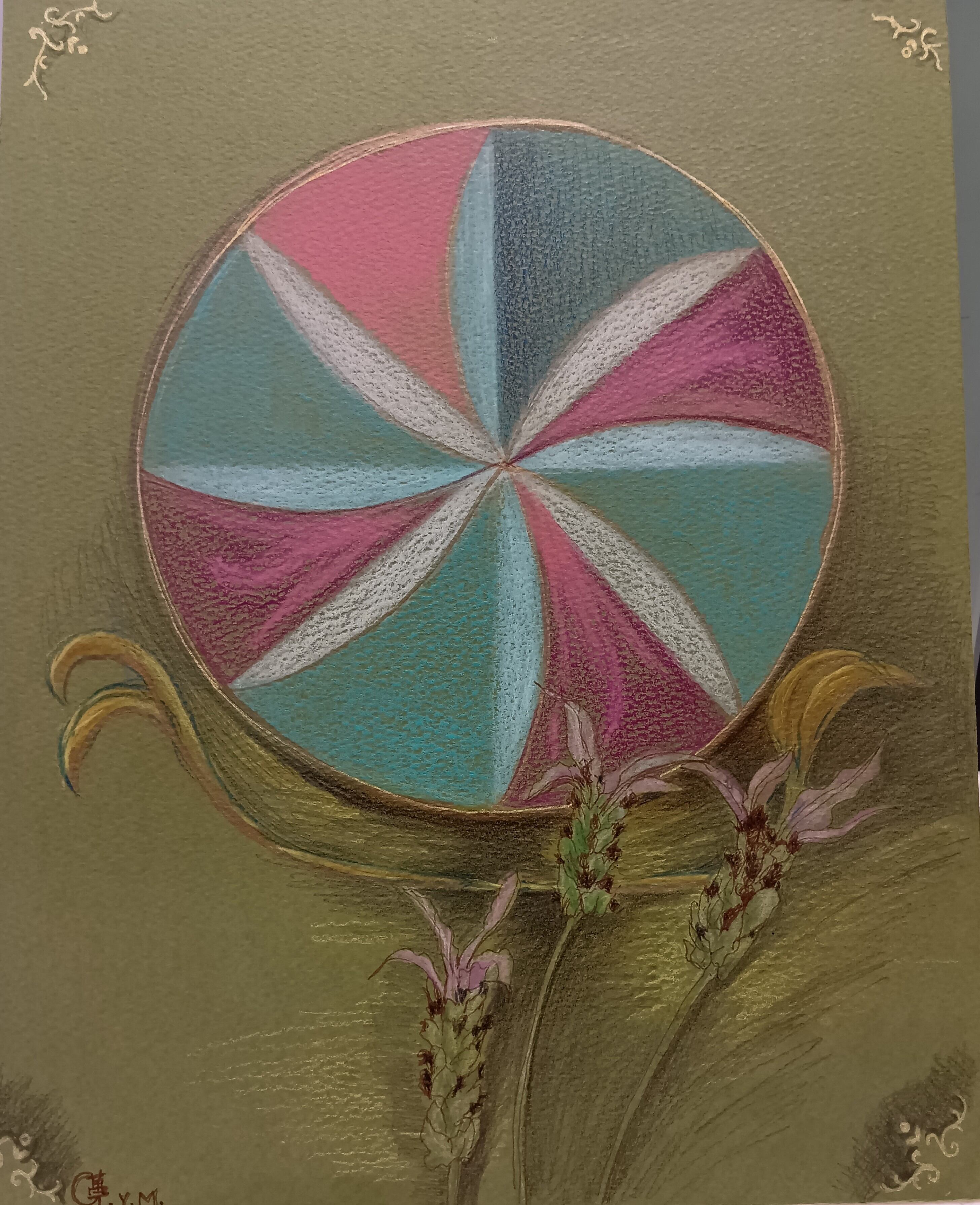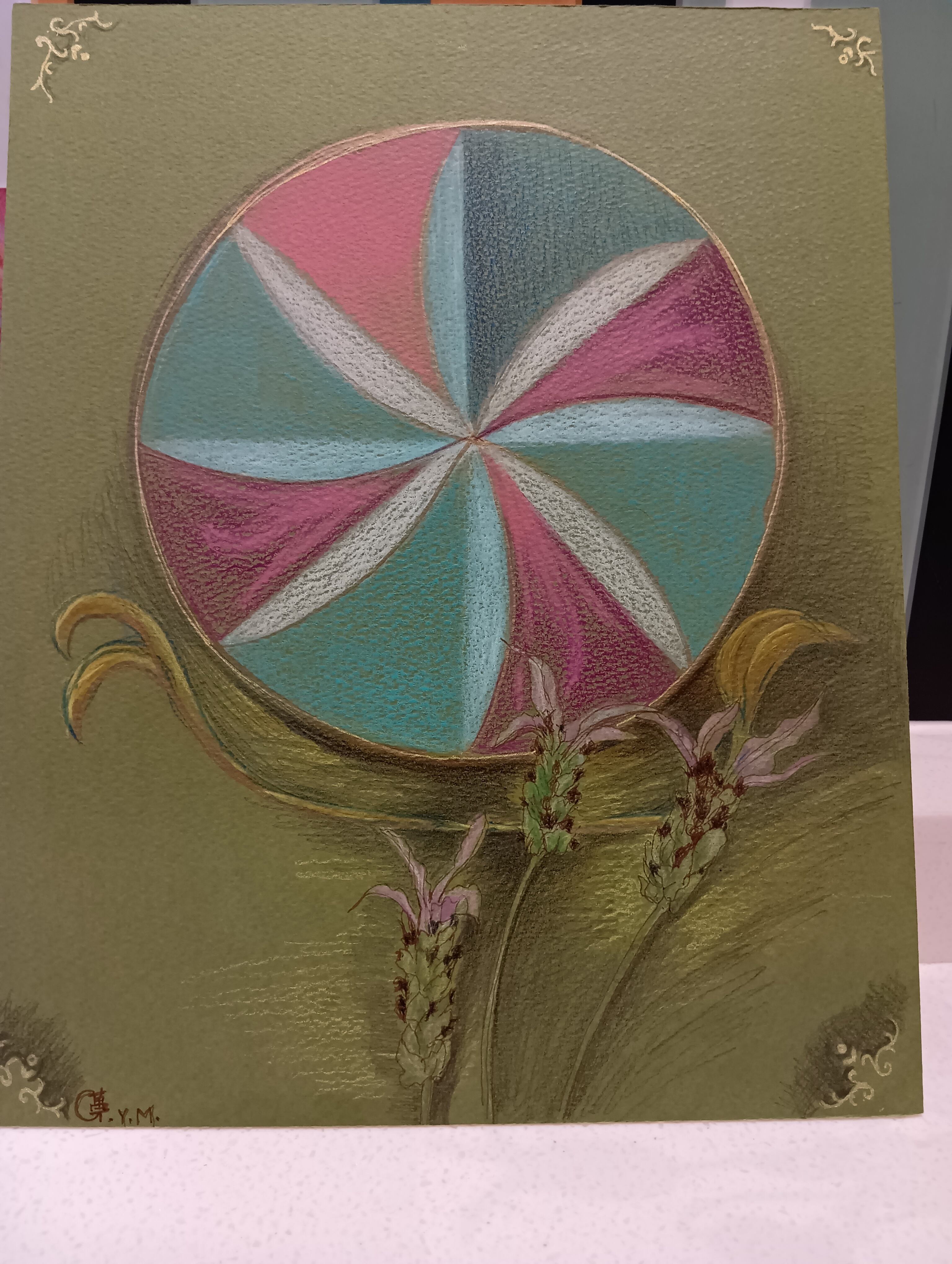 カラーイラストボード(F3号27.3cm×22cm)に、水彩色鉛筆と金ペンで彩画しております。イラストボードですので、額装なしに気軽にどこでも飾ることが出来ます。(湿気のあるところの展示はお控えください)